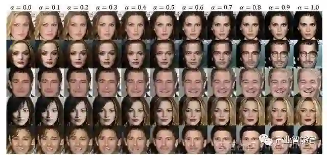 中线性地插值。生成器已经从CelebA数据集中学习了图像的分布。α=0.0对应着从向量z1生成一个图像,而α=1.0则意味着图像来自向量z2。通过改变alpha的取值,我们可以在潜在的空间内进行插值,效果非常好。