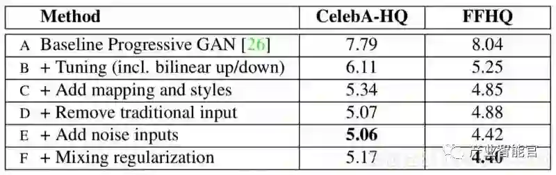 本文介绍了两个数据集的最新结果,一个是由名人图片组成的— CelebA-HQ,另一个是由“普通”人图片组成的、更加多样化的新数据集— Flickr-Faces-HQ (FFHQ)。下图显示了模型的不同配置的Frèchet inception distance (FID)得分