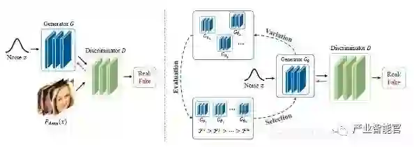 原始的GAN框架(左)与E-GAN框架(右)。在E-GAN框架中,全部的Gθ生成器在一个动态环境中进化 — 即识别器D。该算法涉及三个阶段:变化、评估和筛选。最好的子版本被保留下来以供下一次迭代的时候使用。