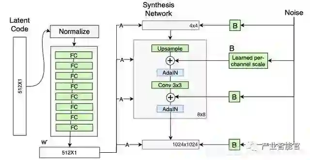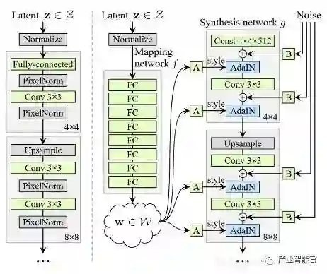 传统的GAN架构(左)与基于样式的生成器(右)。在新的框架中,我们有两个网络组件:映射网络f与综合网络g。前者将一个潜在的代码映射到一个中间的潜在空间W,W对样式的信息进行编码。后者利用生成的样式和高斯噪声来创建新的图像。块“A”是一个训练过的仿射转换,而块“B”将训练过的每个通道的比例因子应用于噪声的输入。
