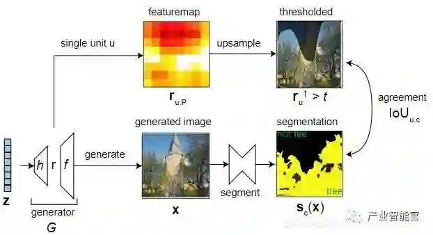 解析 — 我们要识别那些有趣的类,它们在r中有一个明确的表示方法。这基本上是通过比较两个图像来完成的。首先通过计算x获得第一个图像,然后通过语义分割网络来运行。这将返回与目标类别(例如:树木)相对应的像素位置。第二个图像是通过用ru,p进行上采样,因此它与sc(x)的维度相匹配,然后再对其进行阈值处理,以便对被这个特定单元所“发亮”的像素做出艰难的决定。最后,我们计算了两个输出之间的空间一致性。值越高,单元u对类c的因果效应就越大。通过对每个单元执行这个操作,我们最终应该找出哪些类在r的结构中有一个明确的表示方法。