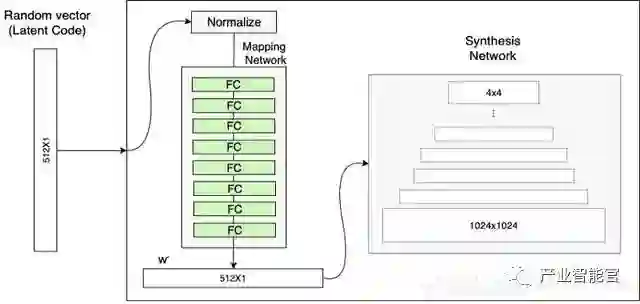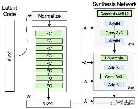 映射网络的目标是将输入向量编码为中间向量,中间向量的不同元素控制不同的视觉特征。这是一个非常重要的过程,因为使用输入向量来控制视觉特征的能力是非常有限的,因为它必须遵循训练数据的概率密度。例如,如果黑头发的人的图像在数据集中更常见,那么更多的输入值将会被映射到该特征上。因此,该模型无法将部分输入(向量中的元素)映射到特征上,这一现象被称为特征纠缠。然而,通过使用另一个神经网络,该模型可以生成一个不必遵循训练数据分布的向量,并且可以减少特征之间的相关性。