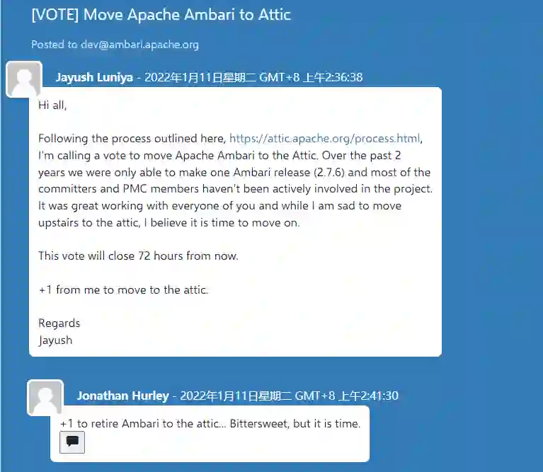 1 月 10 日,Cloudera 的工程师、Apache Ambari PMC 主席 Jayush Luniya 给 Ambari 社区发送了一封邮件,发起了“将 Apache Ambari 移至 Attic”的投票。在过去的两年里,Ambari 只发布了一个版本(2.7.6),大多数提交者(Committer)和 PMC 成员都没有积极参与到这个项目中来。
