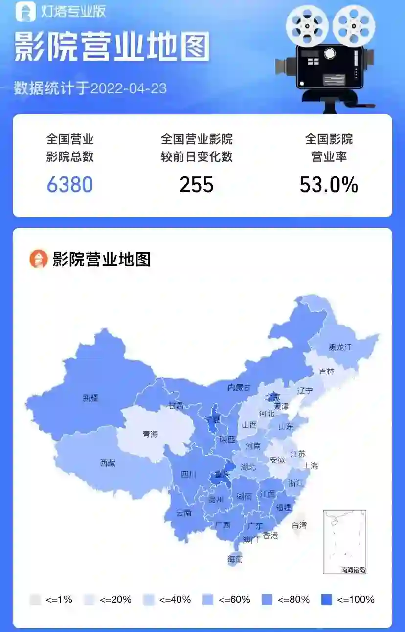 灯塔专业版数据显示,截至2022年4月23日,全国营业影院总数为6380家,整体营业率为53%。