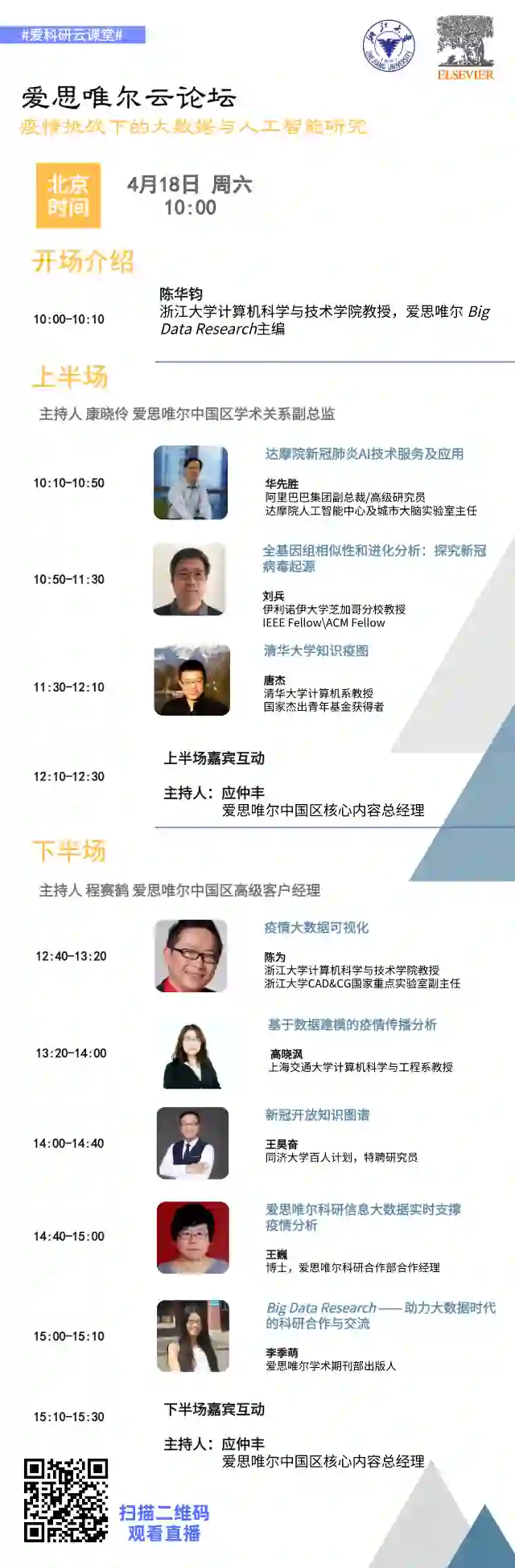 2020注定是不寻常的一年,新冠肺炎疫情在全球多点暴发并迅速蔓延,给社会带来巨大影响的同时,也为大数据与人工智能研究者带来新的挑战。值此疫情之际,由爱思唯尔旗下大数据期刊Big Data Research发起的“爱思唯尔云论坛:疫情挑战下的大数据与人工智能研究”将于4月18日在线举办。