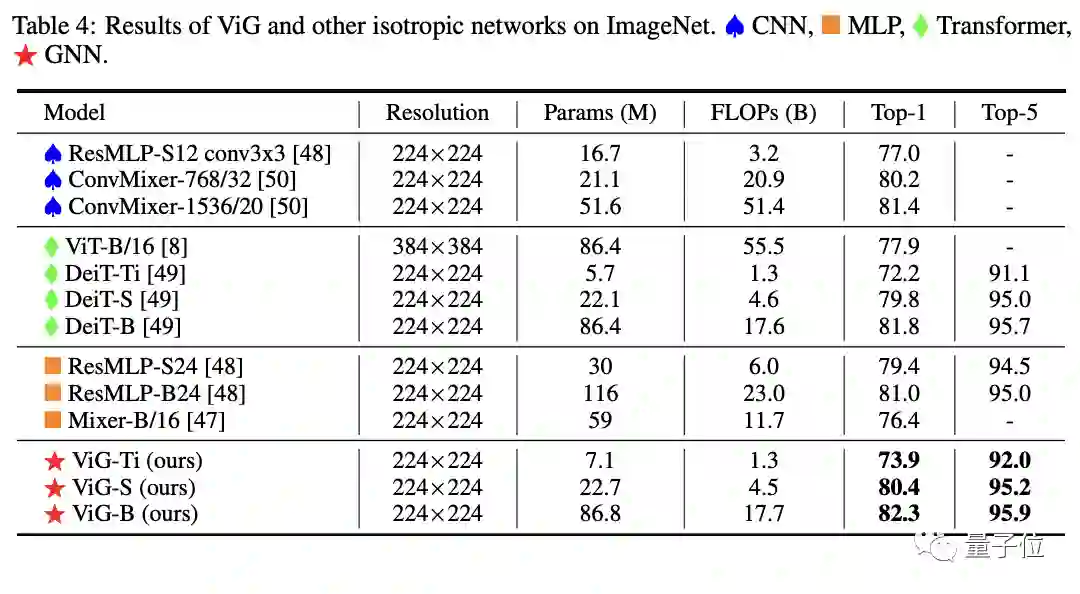 同等算力成本下,ViG也与最先进的CNN、ViT和MLP相比,性能也能超越或表现相当。