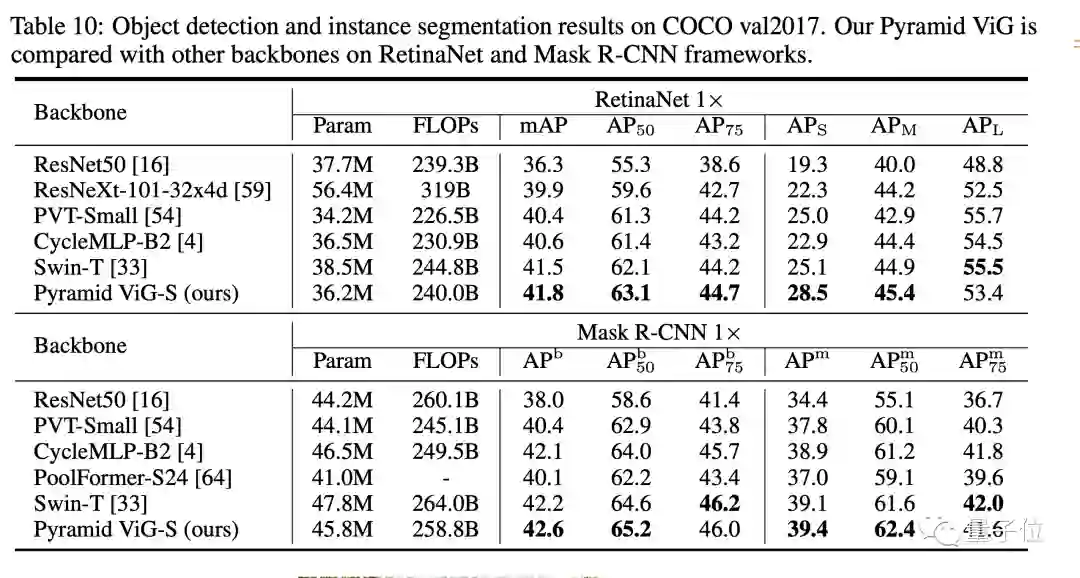 在目标检测和实例分割测试上,ViG表现也与同等规模的Swin Transformer相当。