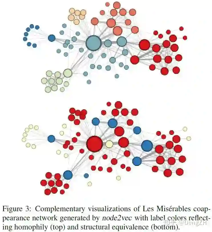 但事实上,论文中给出的结论却是 DFS擅长学习网络的同质性,BFS擅长学习网络的结构性。从论文里的 Figure 3 中我们可以直观地进行观察: