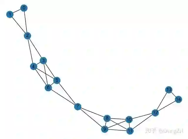 然后再分析一下聚类效果。可以看到 DFS 得到的 embedding 分布比较均匀,不像 BFS 那样会出现比较大的差距。设定的游走序列长度为10,窗口大小为5,在这个网络中相邻结点有类似的上下文的可能性是比较高的,比方说结点10、11和结点12,它们的上下文会比较像,因此 embedding 的结果也会比较像。在 BFS 中上下文不会那么相似,因此 embedding 结果也就会差距更大一些。聚类的话,其实这个网络聚簇现象并不明显,所以 DFS 的结果没有看出有很明显的聚类边界,更倾向于把整个网络分为一个簇;而 BFS 就很明显地把这个网络分为了5个簇,密集连接的部分分到一个簇中,两边的边缘结点各一个簇,两个作为连接枢纽的结点各一个簇。