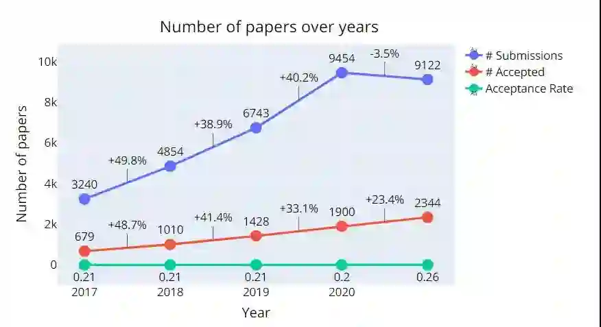 据大会官方统计,今年 NeurIPS 共有 9122 篇有效论文投稿,共接收 2344 篇,总接收率 26%,有 3% 被接收为 Spotlight 论文。相比去年,论文接收率稍高了一些,达到了 2013 年以来的最高水平。