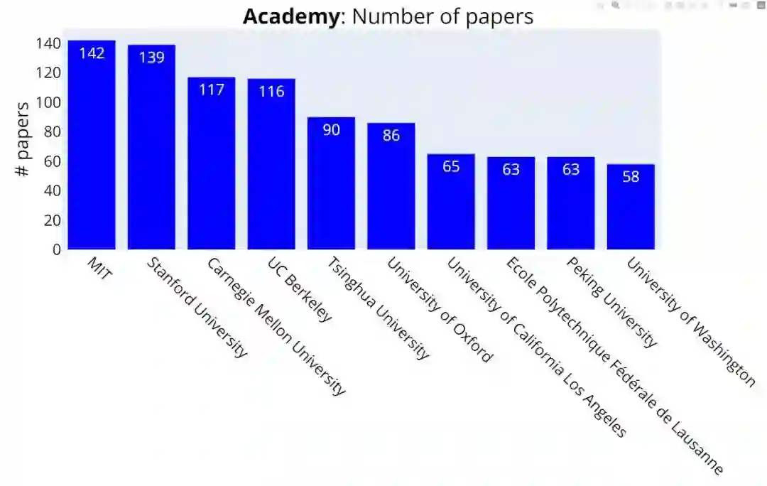 中稿量排名前三的学校分别是 MIT(142 篇)、斯坦福大学(139 篇)、CMU(117 篇)。加州大学伯克利分校以 1 篇之差(116 篇)排名第四。清华大学以 90 篇论文排名第五,北京大学以 63 篇论文排名第九。
