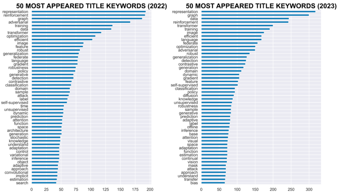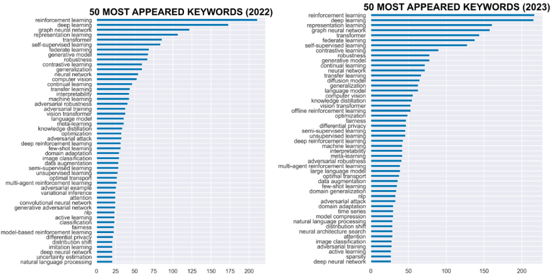以下条形图列举了提交论文中出现频率排名前 50 的关键词,排名靠前的依旧是强化学习,深度学习,表征学习 以及图神经网络等。两年的投稿趋势变化不大。