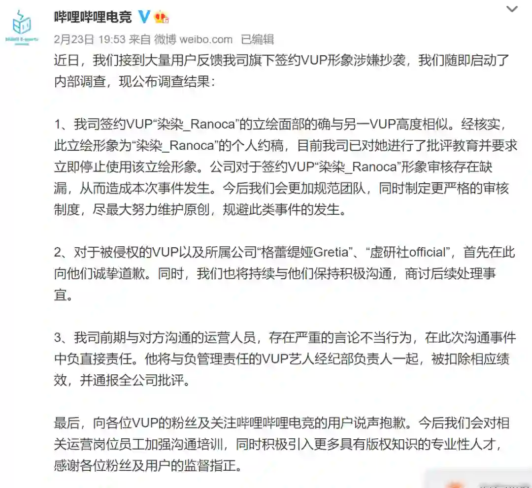 昨日,微博网友@菊菊菊菊菊花猹发文称,朋友设计的VUP形象被哔哩哔哩电竞官方照搬,并在反复交涉无果后,只得到傲慢的答复,此外还将UP主发布的视频删除,最终无奈发博维权。@哔哩哔哩电竞官方微博 之后发文回应,称此立绘形象为 “ 染染_Ranoca ” 的个人约稿,已对她进行了批评教育并要求立即停止使用该立绘形象。与对方沟通的运营人员,存在严重的言论不当行为,将与负管理责任 VUP 艺人经纪部负责人一起,被扣除相应绩效,并通报全公司批评。(3DM)