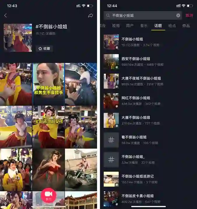 在抖音上,#不倒翁小姐姐 话题浏览量已经超过 15 亿,相关话题累计近 17 亿。