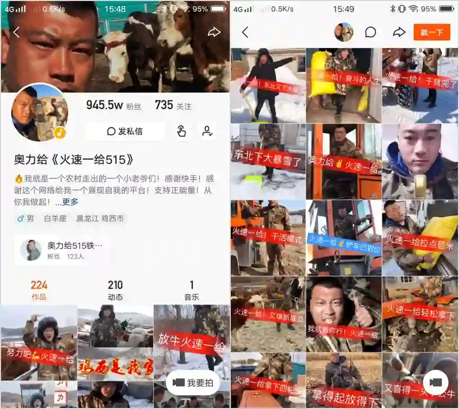 这句像劳动号子一样,坚实有力朗朗上口的“奥利给”在快手上得到了广泛传播。