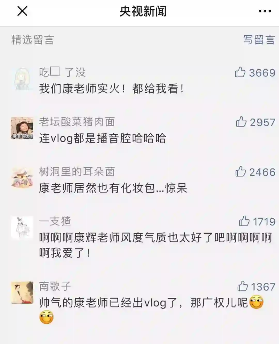 #撒贝宁的思维能力太强了#、 #朱广权的段子真香# 、#康辉vlog# 等话题不断登上热搜,康辉、撒贝宁、朱广权甚至还被网友喊话出道央视 boys。