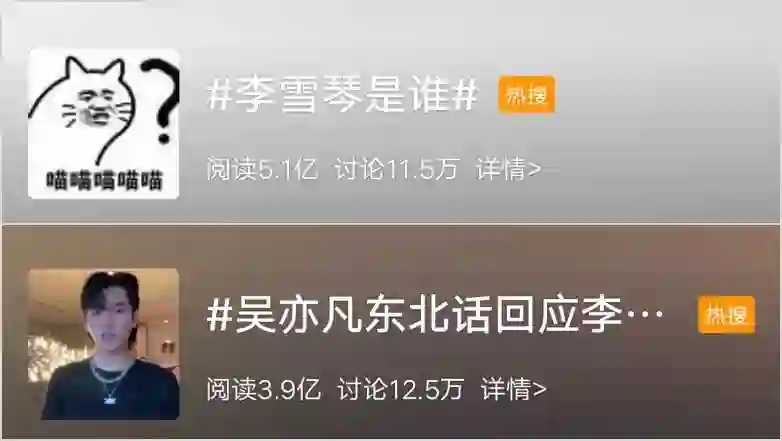 一时间 #李雪琴是谁# 和#吴亦凡东北话回应李雪琴#两个话题迅速蹿上了微博热搜,通过自我介绍就召唤出了爱豆,称得上是“追星锦鲤”了。