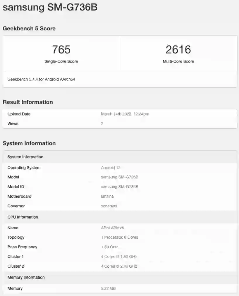 三星通常每年都会发布一款三防智能手机和平板电脑,这些设备的配置一般都不高,不过今年似乎要改变了。据悉,三星 Galaxy Xcover Pro 2 三防手机已经出现在了 Geekbench 跑分中,型号为 SM-G736B,搭载高通骁龙 778G 处理器。跑分数据显示,该机的骁龙 778G 单核跑分 765,多核跑分 2616,配备了 6GB 内存,也就是中端机的正常水平,不过放在三防手机中算是高配置了。据 SamMobile 报道,Galaxy Xcover Pro 2 可能是 Galaxy A73 的重新设计版本,配备 Super AMOLED 显示屏、更差一些的摄像头,当然还有 MIL-STD 军用等级认证。