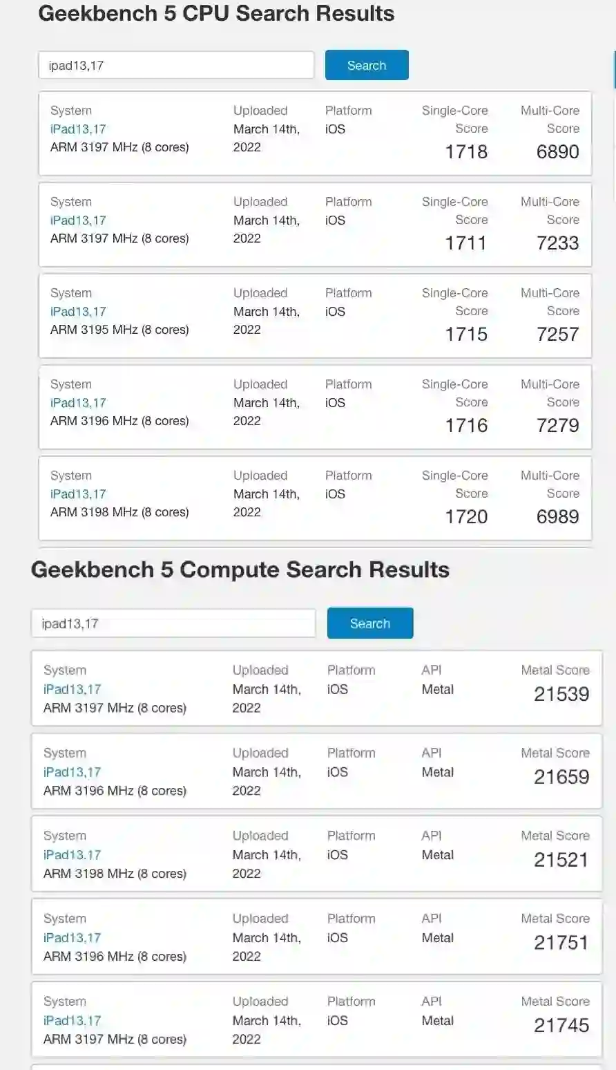 据外媒macrumors报道,根据 Geekbench 5 的结果显示,iPad Air 5 中的 M1 芯片具有与 iPad Pro 相同的 3.2GHz 工作频率。因此,M1 iPad Air 5 的性能几乎与 M1 iPad Pro 相同。M1 iPad Air 5 的平均单核和多核得分分别约为 1700 和 7200,这些分数证实 M1 iPad Air 5 的性能与 M1 iPad Pro 相当,同时比采用 A14 Bionic 芯片的 iPad Air 4 快约 60% 至 70%。值得注意的是,iPad mini 6 的 A15 Bionic 芯片已降至 2.9GHz,而 iPhone 13 和 iPhone 13 Pro Max 等其他设备的 A15 则为 3.2GHz。降频芯片导致 iPad mini 比 iPhone 13 型号慢约 2% 至 8%。