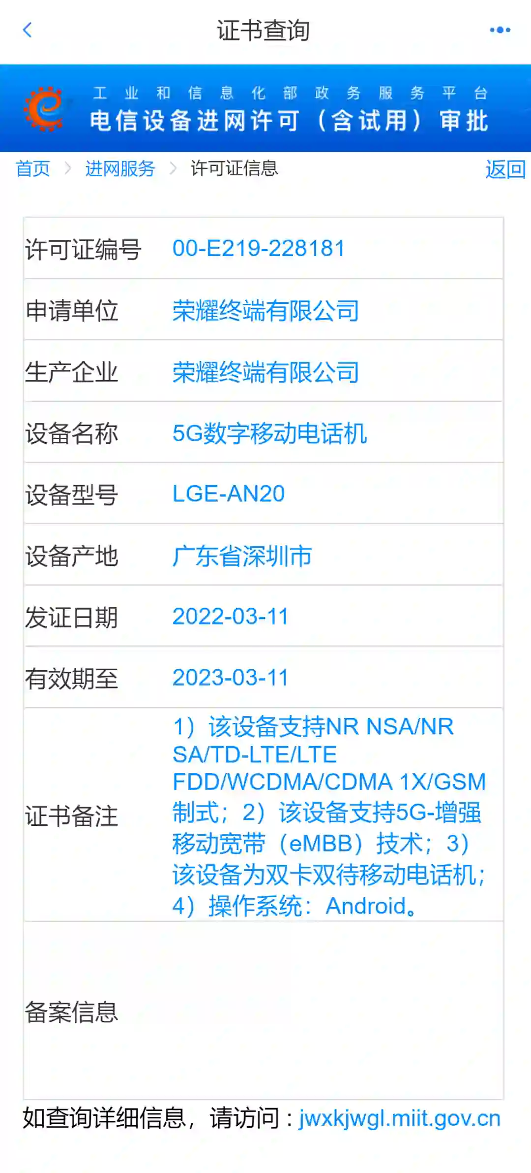 近日,荣耀三款新机现已通过工信部入网,型号分别为 VNE-AN00 、 CMA-AN40和LGE-AN20,目前工信部未公开新机参数详情。不过,据 @李昂昂昂啊 爆料,VNE-AN00、 CMA-AN40 两款机型是荣耀中端新机,而 LGE-AN20 则为荣耀 Magic4 至臻版,该机将会在 17 日的发布会上和 Magic4 系列新机一同亮相。