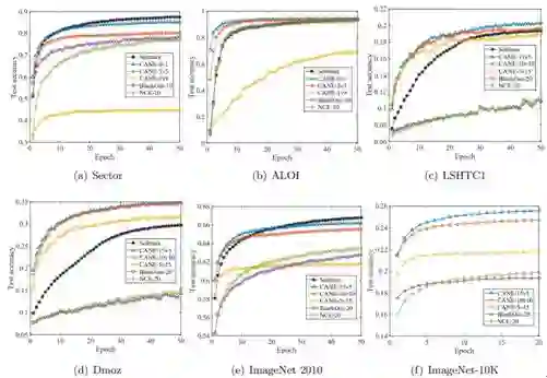 研究者实验了 CANE 方法在有大量类别的多类分类问题和神经语言建模任务中的应用。下图展示了各种方法在不同分类数据集上的测试准确度随 epoch 的变化情况。可以看到,有更大候选项集的 CANE 在准确度方面基本优于其它方法,有时甚至能超过 softmax 方法。而且 CANE 方法的收敛速度明显胜过噪音对比估计(NCE)和 Blackout。