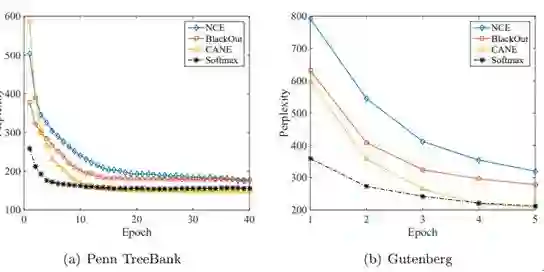 下图则给出了神经语言建模实验的结果。可以看到,CANE 方法的收敛速度比 NCE 和 Blackout 更快,同时还达到了与 softmax 方法同等的困惑度。