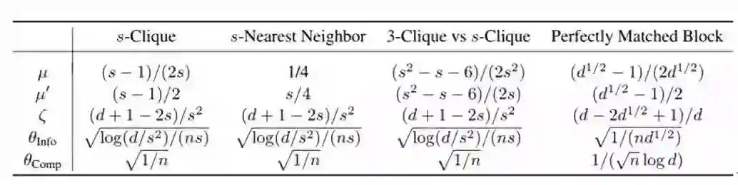 这两个结构量的一大突出性质是它们仅依赖于被测试的组合结构的拓扑性质。它们能帮助研究者理解组合推理问题的结构性质决定其计算复杂度的方式。研究表明,如果 µ 远小于 µ',则信息论下界和计算有效的下界之间会存在明显差距。下面给出了 4 个案例的具体最优比率;可以看到,这些案例都存在统计与计算的权衡。