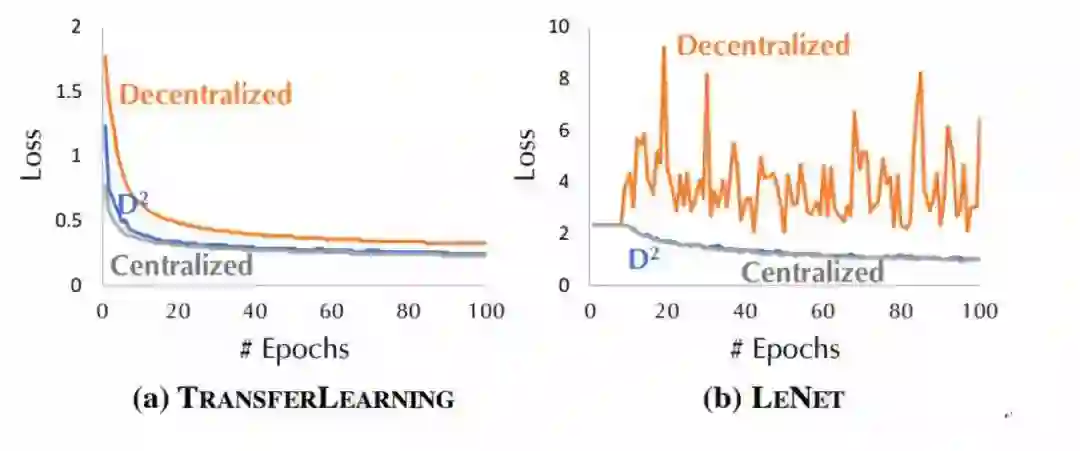 可以看到,D-PSGD 算法的收敛速度比中心化方法慢,而 D2 也比 D-PSGD 快很多,并且损失非常接近中心化算法。