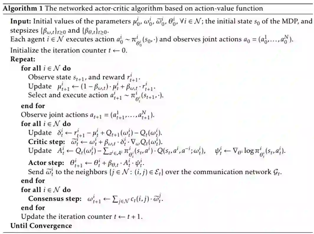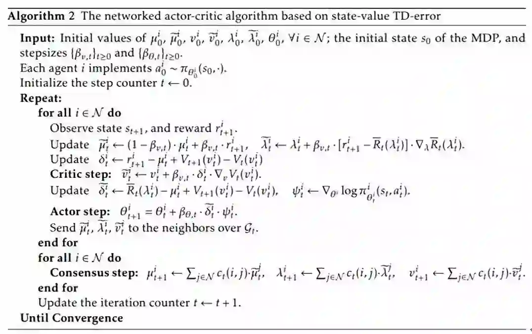 具体来说,actor 步骤是由每个智能体单独执行的,无需推断其它智能体的策略。对于 critic 步骤,研究者提出了一种在整个网络通过通信实现的共识更新(consensus update),即每个智能体都会与其网络中的临近智能体共享其价值函数的估计,从而得到一个共识估计。这个估计又会被用在后续的 actor 步骤中。通过这种方式,每个智能体的局部信息都能散布到整个网络,从而最大化整个网络层面的奖励。