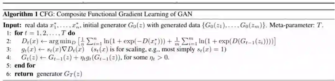 基于这一理论,研究者提出了一种稳定的新型生成对抗方法,即复合函数梯度学习(CFG);如算法 1 所示。