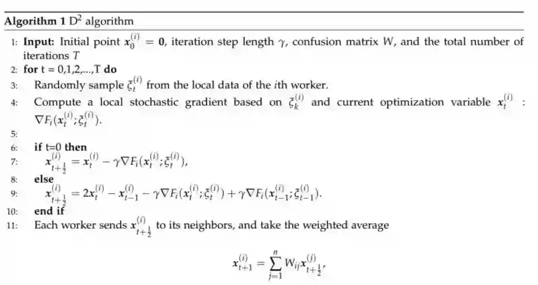 D2 基于标准的 D-PSGD 算法,但添加了一个降低方差的组件。在这种 D2 算法中,每个工作器都会存储上一轮迭代的随机梯度和局部模型,并将它们与当前的随机梯度和局部模型线性地结合到一起。这能将收敛速度改善,其中 ζ2 是不同工作器上的数据差异,σ2 是每个工作器内的数据方差,n 是工作器的数量,T 是迭代次数。