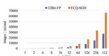 在使用 512 个 GPU 进行训练时,ECQ-SGD 相对于普通 SGD 实现了 143.5% 的加速(每秒各 66.42k 与 27.28k 张图像)。如果节点之间的带宽更小,这样的优势还会更加显著。