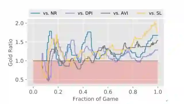 研究者还使用深度神经网络实现了这种基于反馈的树搜索算法并在《王者荣耀》1v1 模式上进行了测试。为了进行对比,研究者训练了 5 个操控英雄狄仁杰的智能体,结果他们提出的新方法显著优于其它方法,下图给出了他们的方法训练的智能体相对于其它智能体随时间的金币比值变化。