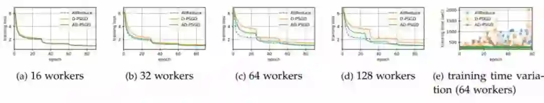 下图给出了在 ImageNet 数据集上基于 ResNet-50 模型得到的训练损失和每 epoch 训练时间情况。可以看到,AD-PSGD 和 AllReduce-SGD 的收敛情况接近,都优于 D-PSGD。在使用 64 个工作器时,AD-PSGD 每 epoch 耗时 264 秒,而另外两种方法每 epoch 耗时会超过 1000 秒。