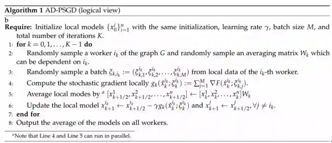 研究者在这篇论文中提出了一种异步去中心化并行随机梯度下降(AD-PSGD),能在异构环境中表现稳健且通信效率高并能维持最佳的收敛速率。理论分析表明 AD-PSGD 能以和 SGD 一样的最优速度收敛,并且能随工作器的数量线性提速。下面是该算法的工作过程: