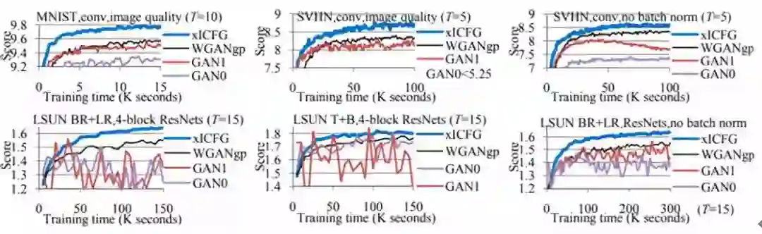 可以看到,尽管 GAN1(使用了 logd 技巧的 GAN)在 LSUN 数据集上偶尔有更优的表现,但 xICFG 的表现总体更优且更稳定。