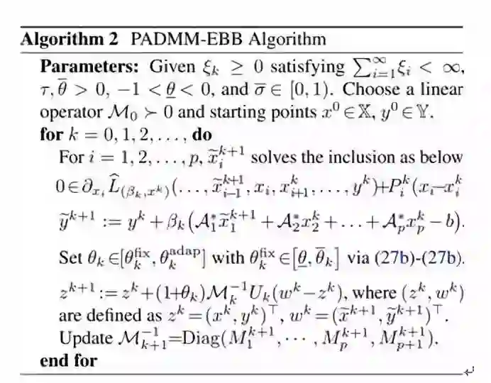 研究者还提供了该框架的迭代复杂度和局部线性收敛速率,从理论上证明一个较大的超松弛步长有助于加速 VMOR-HPE。并且,研究者在文中严格证明了VMOR-HPE算法框架包含大量一阶原始算法和一阶原始-对偶算法为特例。此外,研究者还将 VMOR-HPE 应用到了一类 具有线性等式约束的多块可分复合凸优化问题的KKT 广义方程上,得到了一种尺度化的外梯度校正步骤的临近交替方向乘子法(PADMM-EBB),在该步骤中的尺度化矩阵是通过一种分块式的 Barzilai-Borwein 线搜索技术生成的。该算法的迭代格式如下: