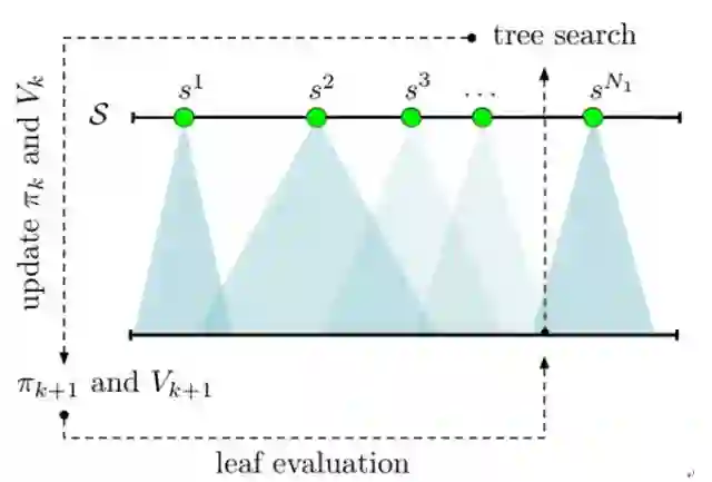 研究者将这一思想融合到了一个基于反馈的框架中,其中 MCTS 会使用其根节点处生成的观察结果来更新自己的叶节点评估器。其反馈过程如下图所示:(1)从一批采样的状态(三角形)开始运行一组树搜索,(2)使用第 k 次迭代时的策略函数近似(PFA)πk 和价值函数近似(VFA)Vk 的叶估计被用于树搜索过程,(3)使用树搜索结果更新 πk+1 和 Vk+1。