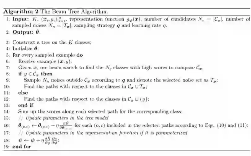 另外,研究者还使用了一种树结构(叶表示类别)来促进对候选项选择的快速波束搜索(算法 2)。这种波束搜索具有更低的复杂度,能快速得到预测结果,还能自然地输出最靠前的多项预测。