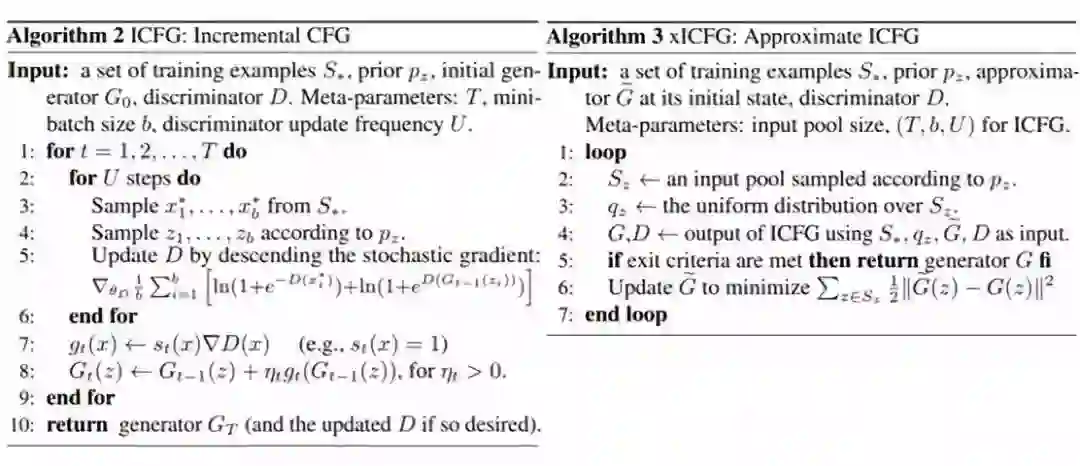 在此基础上,研究者又提出了渐进式 CFG(ICFG,见算法 2)以及更进一步的近似式 ICFG(xICFG,见算法 3)。其中 ICFG 是以渐进方式使用生成器的更新一点一点地逐步更新鉴别器,使得生成器可以不断提供新的更有难度的样本,从而防止鉴别器过拟合。而 xICFG 则能通过训练一个固定大小的近似器(近似 ICFG 所获得的生成器的行为)来对 ICFG 得到的生成器进行压缩,从而提升效率。
