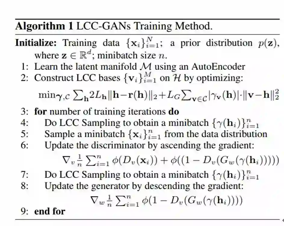 上图展示了该论文提出的 LCC-GAN 方案。研究者首先使用了一个自动编码器(AE)在隐含流形上学习了嵌入来获取数据中的含义信息。然后,他们又使用 LCC 学习一组基数来在该隐含流形上构建局部坐标系统。之后,他们再通过使用一个与一组编码相关的线性函数来近似生成器而将 LCC 引入了 GAN。基于这种近似,他们再通过利用在隐含流形上的局部信息而提出了一种基于 LCC 的采样方法。LCC-GAN 的具体训练过程如下: