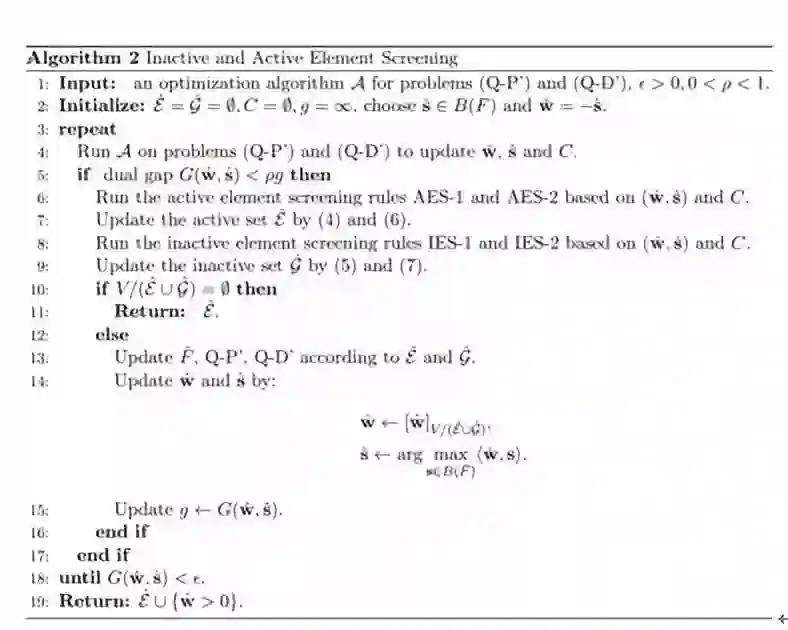 研究者首先研究了 SFM 和对应的凸近端问题之间的关系,还研究了这些近端问题的准确原始最优估计。基于该研究,他们提出了一种全新的安全筛选方法:不活动和活动元素筛选(IAES)。该框架由两个筛选规则构成:不活动元素筛选(IES)和活动元素筛选(AES);这两个规则在 IAES 框架中是交替执行的,如下算法 2 所示。