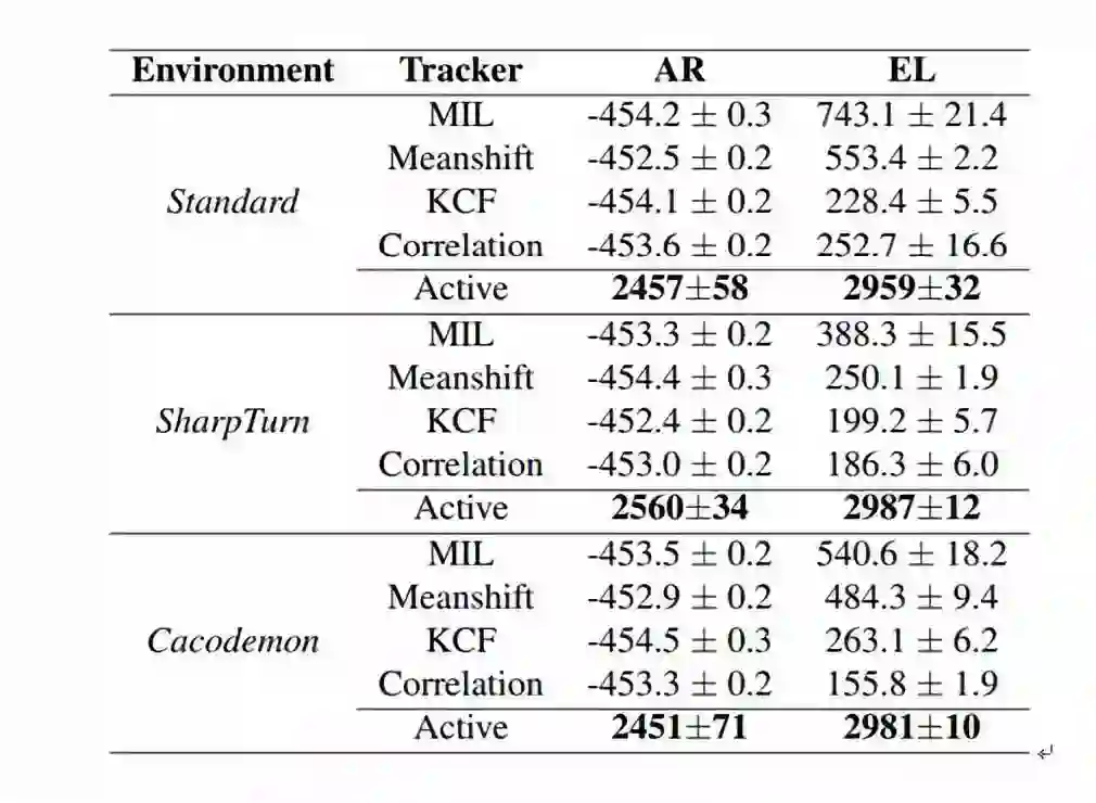 实验结果表明,这种端到端的主动跟踪方法能取得优异的表现,并且还具有很好的泛化能力,能够在目标运动路径、目标外观、背景不同以及出现干扰目标时依然稳健地执行主动跟踪。另外,当目标偶尔脱离跟踪时(比如目标突然移动),该方法还能恢复对目标的跟踪。下表给出了不同跟踪方法在 ViZDoom 环境的几个不同场景上的表现比较,其中 AR 表示累积奖励(类似于精确度),EL 表示 episode 长度(类似于成功跟踪的持续帧数)。