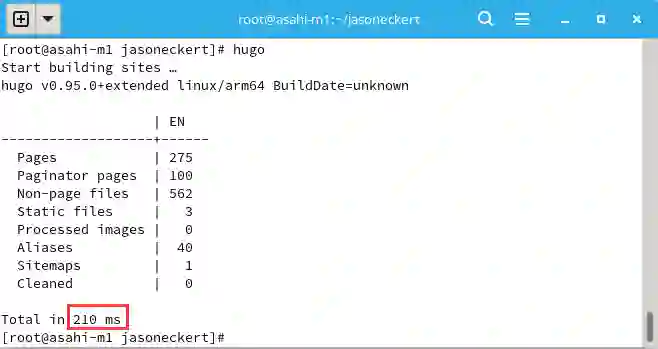 这次,Jason Eckert 依旧遵循着“控制变量”法:在上次测试的同一台 M1 Mac 上安装 Asahi Linux,确保数据结果只受操作系统影响。结果令 Jason Eckert 再次感到意外:“相比同一设备上 macOS 的表现,Asahi Linux 上的 Hugo 只用了不到一半的时间(210 毫秒)就合成了我网站的所有 275 个页面!”(注:macOS 中的 Hugo 是原生的,而非在 Rosetta 中运行)