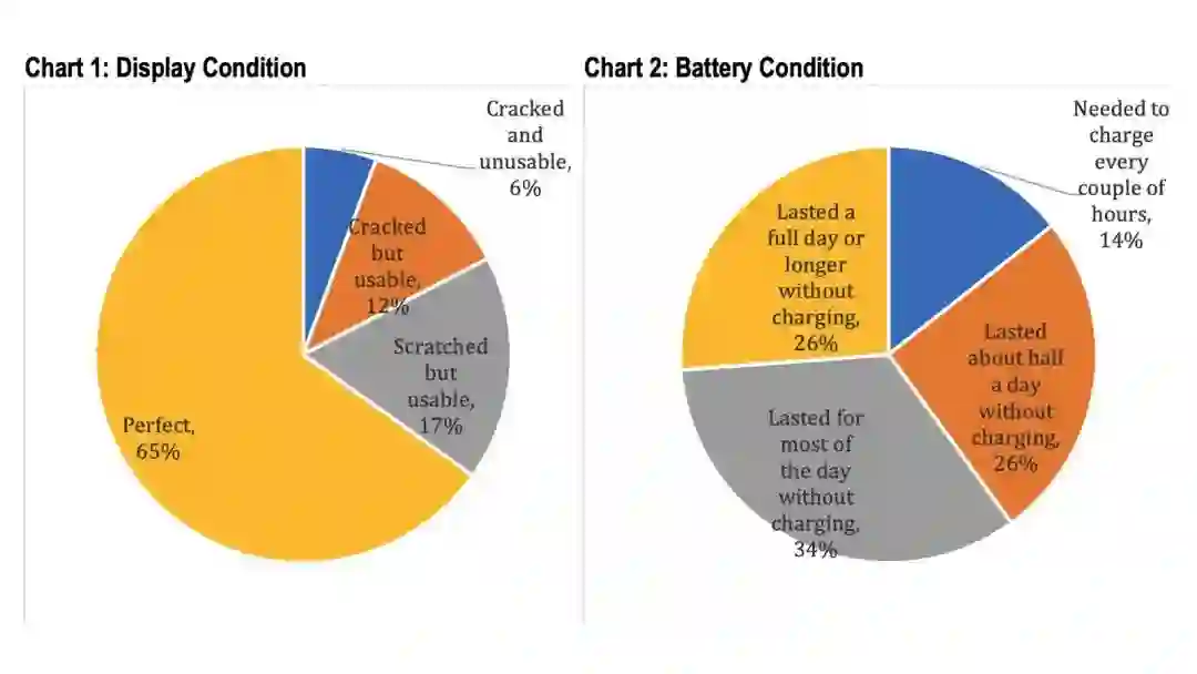 CIRP的研究表明,几乎所有正在使用的iPhone都有一块“可用”状态的屏幕,大多数iPhone的电池也都处于“可用”状态。iPhone屏幕只有12%是破损的状态,但可以使用,而6%的屏幕无法使用,需要更换。据称,26%的iPhone电池在不充电的情况下电池续航时间可达半天,14%的电池需要每隔几个小时充电一次。因此,更换电池可能是最常见的维修之一。