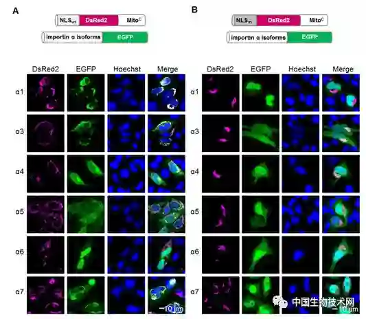图2. 利用Mito-docking研究importin α异构体对SV40 NLS的识别特异性。A. 将含有线粒体锚定信号的野生型NLS(NLSwt)与不同的importin α异构体共转染细胞。发现除α6外,其余几个importin α异构体均被招募到线粒体外膜,从而产生明显的荧光共定位现象。B. NLS突变后(NLSm)不能与任何importin α异构体互作。
