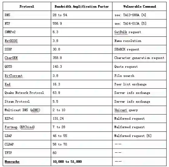 此前各类安全厂商监测到的DRDoS攻击主要是SSDP反射、DNS反射、NTP反射等。下表(引自US-Cert)详细列举了各类反射攻击的放大倍数。