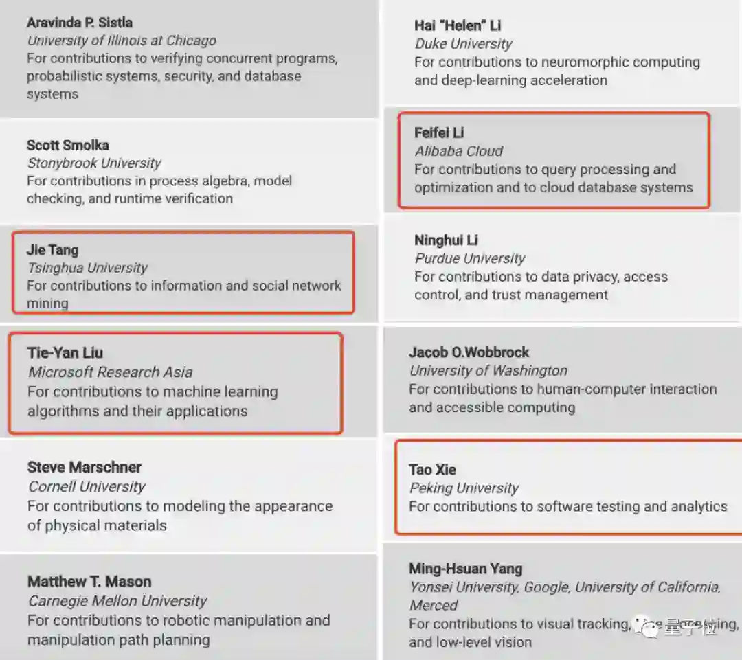除了谢涛,清华大学教授唐杰、阿里云李飞飞、微软亚洲研究院副院长刘铁岩、也是本次新晋ACM Fellow的3位大陆学者。
