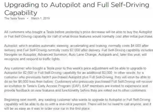 3月1日,特斯拉宣布下调Model S、Model X和Model 3共计8款车型的在华销售价格,其中,Model 3降价幅度为2.6-4.4万元、Model S为1.13-27.75万元、Model X为17.45-34.11万元。特斯拉的这一举动引起了很多老车主尤其是刚提车不久的车主的不满。对此,马斯克回应称,降价前购买特斯拉的车主,可以半价购买自动驾驶仪或全自动驾驶仪。
