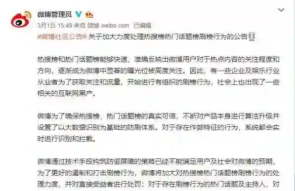 3月1日,新浪发布加大力度处理热搜榜热门话题刷榜行为的公告,微博指出,通过技术手段构筑防御屏障的策略已经不能满足用户及社会对微博的预期,为了更好的遏制和打击刷榜行为,微博将加大对热搜榜热门话题榜刷榜行为的处理力度,并对直接受益者进行处罚:对于存在刷榜行为的热门话题及主持人,对于流量异常搜索词及指向对象进行连带处置。(来源:36氪)